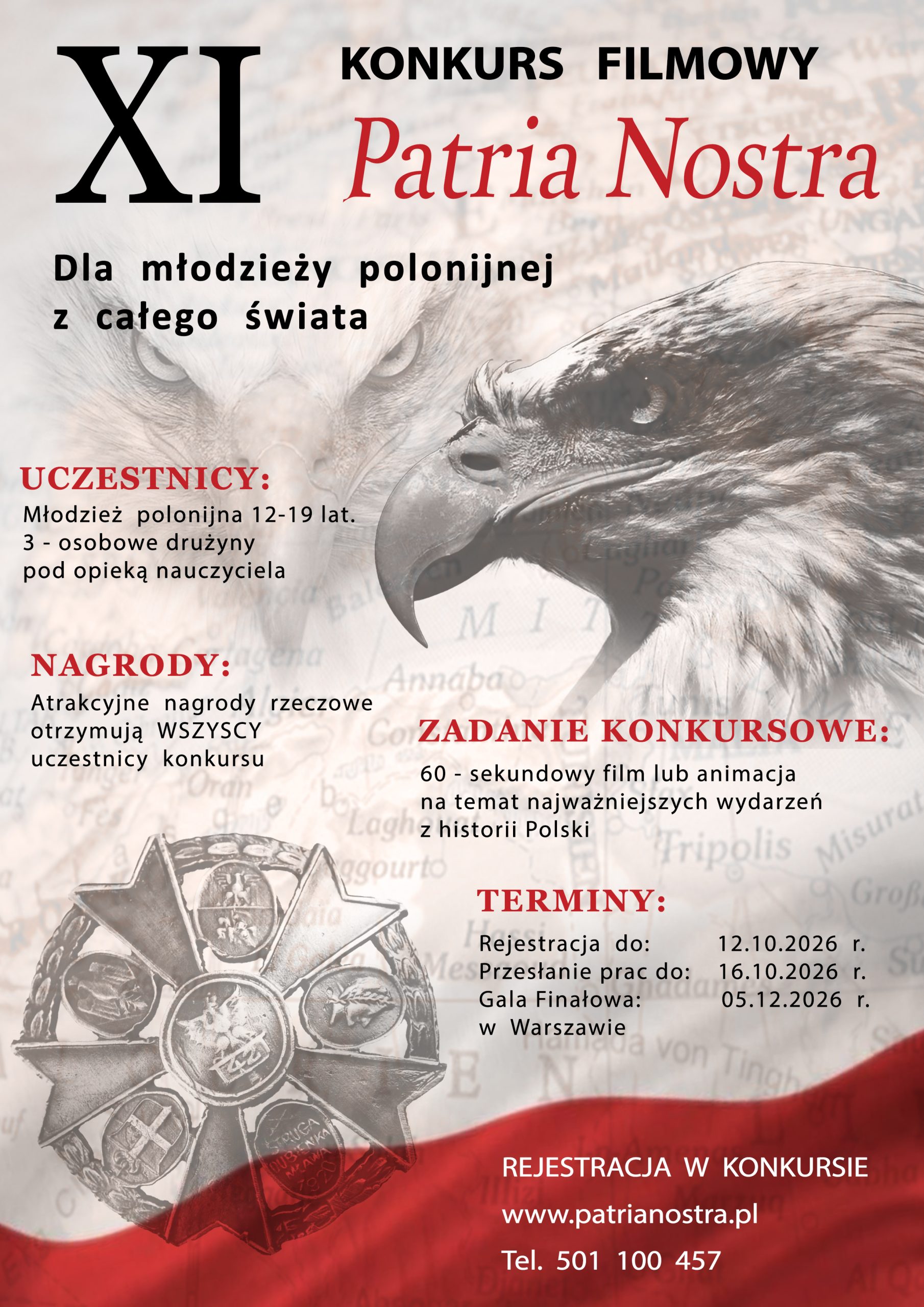 Zapraszamy młodzież polonijną ( oraz młodych przyjaciół innych narodowości, którzy są chętni poznać historię Polski ) i nauczycieli / opiekunów do udziału w XI edycji Filmowego Konkursu Historycznego Patria Nostra- Świat.